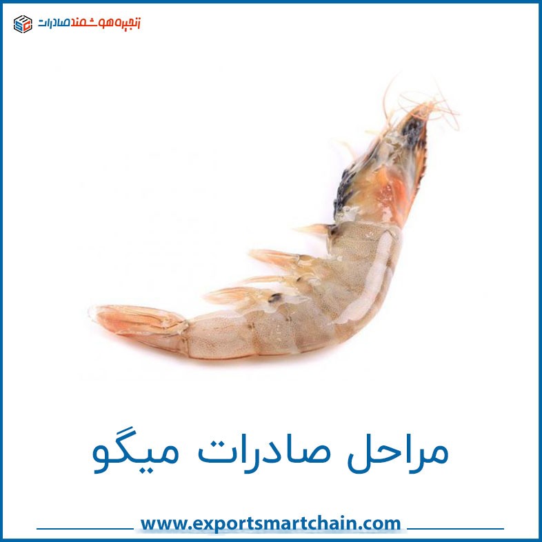 مراحل صادرات میگو در ایران شامل ثبت نام و دریافت مجوز صادرات است. صادرکننده باید ابتدا در سازمان صنایع شیلات و آبزیان یا سازمان توسعه تجارت خارجی ایران ثبت نام کند و مجوز صادرات را دریافت نماید سپس باید مطابق با مقررات بهداشتی و فنی، حوضچههای پرورش میگو را بهرهبرداری کند. محصولات صادره باید مطابق با استانداردهای بهداشتی و فنی مربوطه باشند.